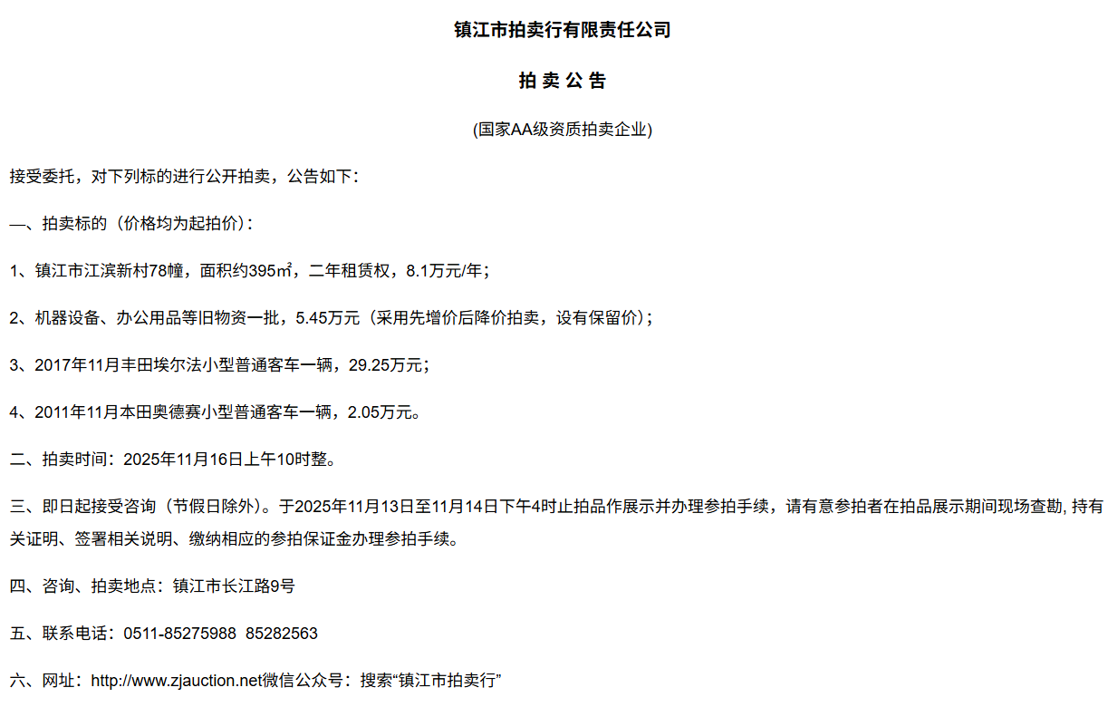 鎮江市拍賣行有限責任公司拍 租 公 吿(國家AA級資質拍賣企業)接受委托,對下列標的進行公開拍租(三拍),公告如下:—、拍租標的(以下價格均為半年至3年租賃權起拍價):1.  建行揚中豐裕支行營業網點二、三、四層經營用房(揚中市三茅鎮三豐南路5號),租賃面積約1080㎡,每層面積約360㎡,三拍底價11.98萬/年(0.3元/平方米/天)。2.  建行揚中油坊支行營業網點三、四層經營用房(揚中市油坊鎮太陽路129號),租賃面積約590㎡,每層面積約295㎡,三拍底價5.34萬/年(0.25元/平方米/天)。3. 建行揚中八橋支行營業網點三、四層經營用房(揚中市八橋鎮太平北路29號),租賃  面積約400㎡,三層約185㎡,四層約215㎡,三拍底價4.43萬/年(0.25元/平方米/天)。以上3套房產均可分層部分出租,拍租價=拍租面積*每平方米每天的租賃單價4. 建行鎮江團山路支行營業網點一層經營用房(鎮江市檀山路8號60幢102、103室),租賃面積約597.09㎡,三拍底價34.52萬/年。5. 建行丹陽原賢橋分理處營業用房(丹陽市城河路15-21號),租賃面積約93.88㎡,二拍底價7.16萬/年。二、拍租時間:2025年11月23日上午10時整。三、即日起接受咨詢(節假日除外)。于11月17日至11月21日下午4時止拍品作展示并辦理參拍手續,請有意參拍者在拍品展示期間現場查勘,持有關證明、簽署相關說明、繳納相應的參拍保證金辦理參拍手續。四、咨詢、拍租地點:鎮江市長江路9號五、聯系方式:0511-85275988   13655299933楊先生六、網址:http://www_zjauction_net.ggxforver.cn;微信公眾號:搜索“鎮江市拍賣行” 拍品清單2025.11.23序號名稱起拍價(元)標的說明1建行揚中豐裕支行營業網點二、三、四層經營用房(揚中市三茅鎮三豐南路5號),租賃面積約1080㎡,每層面積約360㎡三拍底價11.98萬/年(0.3元/平方米/天)1、1-3號房產均可分層部分出租,拍租價=拍租面積*每平方米每天的租賃單價;2、意向競拍人在拍賣前需持營業執照或身份證與委托方說明租賃房產經營業態,確定意向后出具房產承租用途承諾書,經委托方審核后,方可交納保證金參加競拍;3、租賃期限為半年至3年(承租方與出租方協商而定),承租方每半年或一年結付租金,租賃期間的水、電費用及其它相關費用均由承租方承擔;4、承租方不得用于經營和保管危險物品,不得用于開設餐飲、娛樂等可能嚴重影響消防安全、運營安全的經營業態,不得用于經營委托貸款、小額貸款等可能冒用委托方名義,帶來聲譽風險的經營業態。租賃期內,承租方不得破壞墻體結構,自行成就消防、安全等使用條件,不得擅自將租賃房屋轉租、轉讓給他人使用,否則委托方有權收回房屋;5、拍租成交后,承租方將租金交至出租方指定賬戶,傭金交至拍賣方賬戶(拍租傭金為該房屋一個月租金)。承租方憑租賃合同無息退還保證金。2建行揚中油坊支行營業網點三、四層經營用房(揚中市油坊鎮太陽路129號),租賃面積約590㎡,每層面積約295㎡三拍底價5.34萬/年(0.25元/平方米/天)3建行揚中八橋支行營業網點三、四層經營用房(揚中市八橋鎮太平北路29號),租賃面積約490㎡,每層面積約245㎡三拍底價4.43萬/年(0.25元/平方米/天)4建行鎮江團山路支行營業網點一層經營用房(鎮江市檀山路8號60幢102、103室),建筑面積約597.09㎡三拍底價34.52萬/年5建行丹陽原賢橋分理處營業用房(丹陽市城河路15-21號),建筑面積約93.88㎡二拍底價7.16萬/年